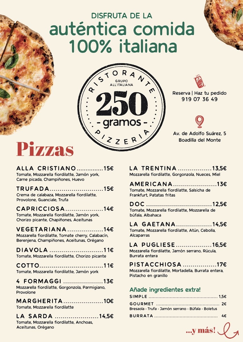 Welcome to 250 GRAMOS, a delightful Italian restaurant nestled in Boadilla del Monte, Madrid. Here, you’ll experience authentic Italian cuisine that marries tradition with modern flair. The menu shines with fresh, high-quality ingredients, making each dish a flavorful masterpiece. Start with an Ensalada Burrata, showcasing creamy burrata paired beautifully with fresh greens and ripe cherry tomatoes. For pasta lovers, the Ravioli De Burrata steals the show, enveloped in a luxurious truffle sauce. Don't miss their heavenly Pizza, especially the unique pumpkin and truffle option that has diners raving. The atmosphere is modern yet cozy, perfect for casual gatherings or intimate dinners. Guests frequently commend the friendly staff and swift service, enhancing the overall dining experience. With a price point that's well-aligned with quality, 250 GRAMOS is not just a meal; it’s a culinary journey you won’t want to miss. Book your table today!